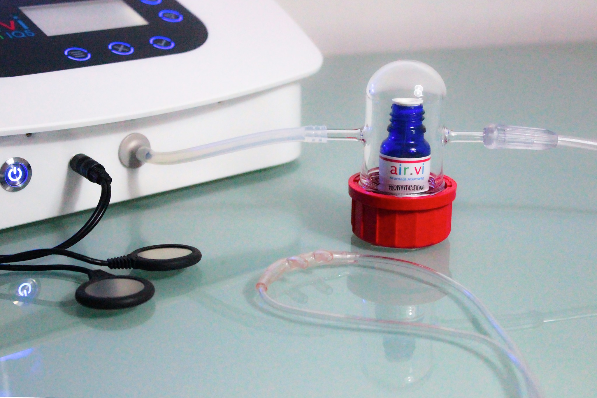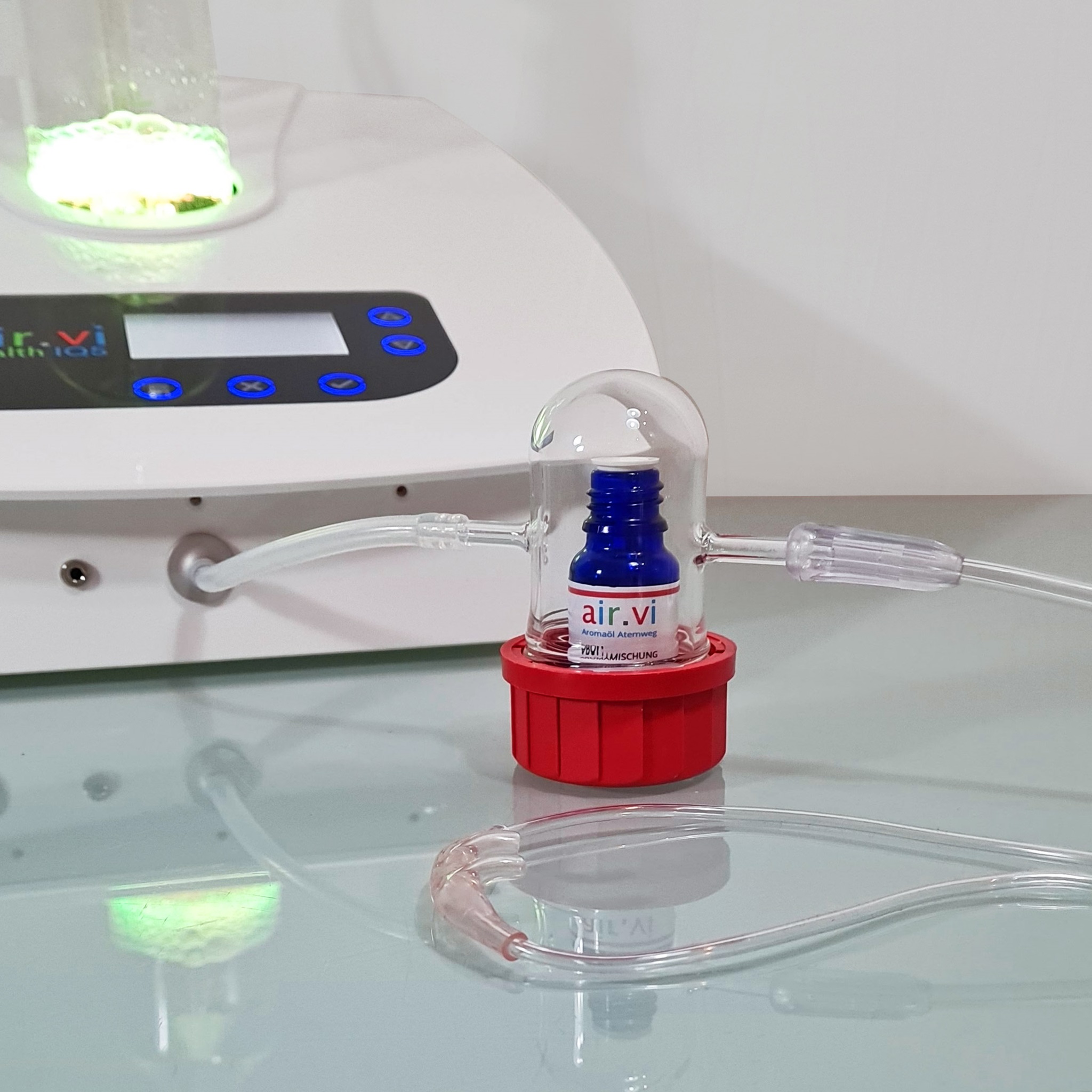 Zusätzlich (normalerweise nicht im Lieferumfang enthalten) ein air.vi Aromakolben und eine Flasche air.vi Aromaöl für Atemwegserkrankungen. Sehr einfache Handhabung individuelle Dosierungsmöglichkeit.